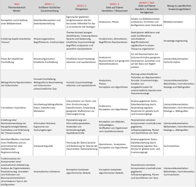 Die Veranstaltungen der Module aus dem Bereich „Informationserschließung und Wissensorganisation“ verfolgen neben der Vermittlung zum Erwerb spezifischen anwendungsorientierten Fachwissens das Ziel, einen Beitrag zur Entwicklung einer Verstehensbasis für